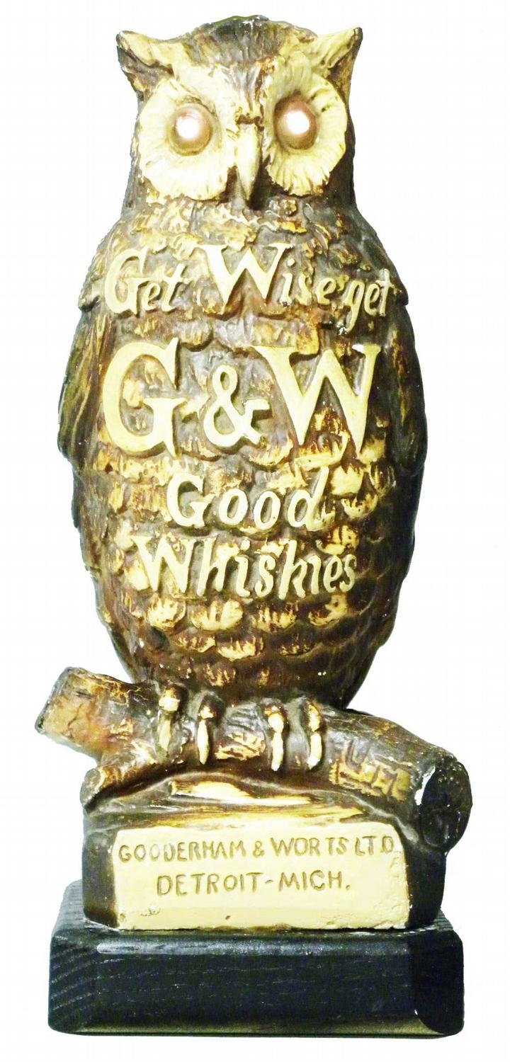 G & W Good Whiskies Plaster Light Up Advertising Figure in the shape of an owl. "Get Wise get G & W". Gooderham & Worts Ltd. Detroit-Mich. Excellent working condition. 13 inches tall.