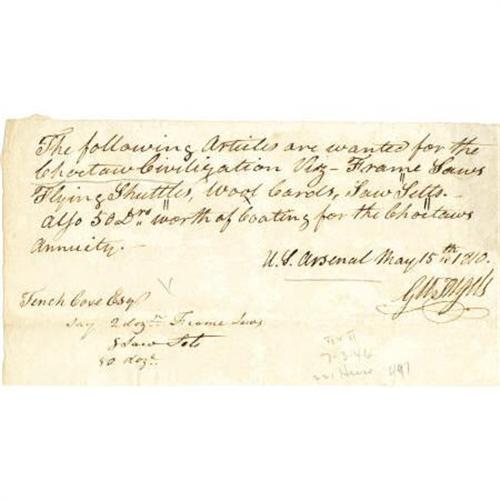 <B>G. W. Ingels Autograph Document Signed,</B></I> one page, 7.75” x 4.25”, n.p., May 15, 1810, to Tench Cove, likely Mississippi. It reads, “<I>The following articles are wanted for the Choctaw Civilization Viz - Frame Saws, Flying Shuttles, Wool Cards, Saw Setts. Also 50 Drs worth of boating for the Choctaw Annuity.</B></I>” Some browning, very fine condition. Written from a “<I>U.S. Arsenal.</B></I>" <I>From the collection of Henry E. Luhrs.</B></I><BR><BR><b>Shipping:</b> Flat Material, Small (<a target="_blank" href="http://www.heritageauctions.com/common/shipping.php">view shipping information</a>)