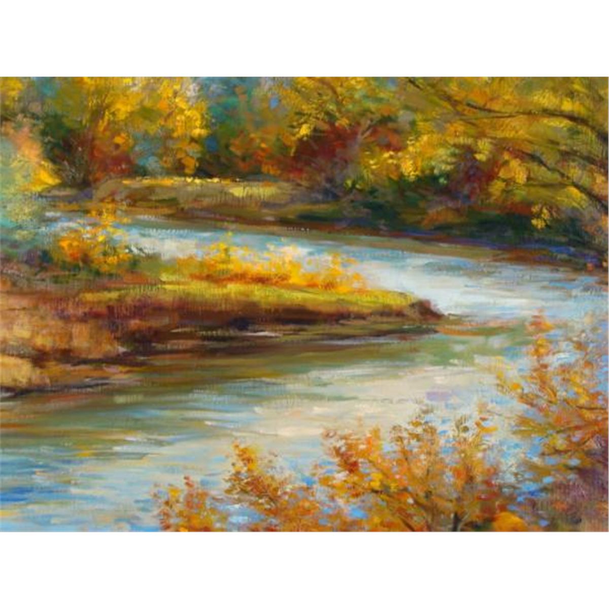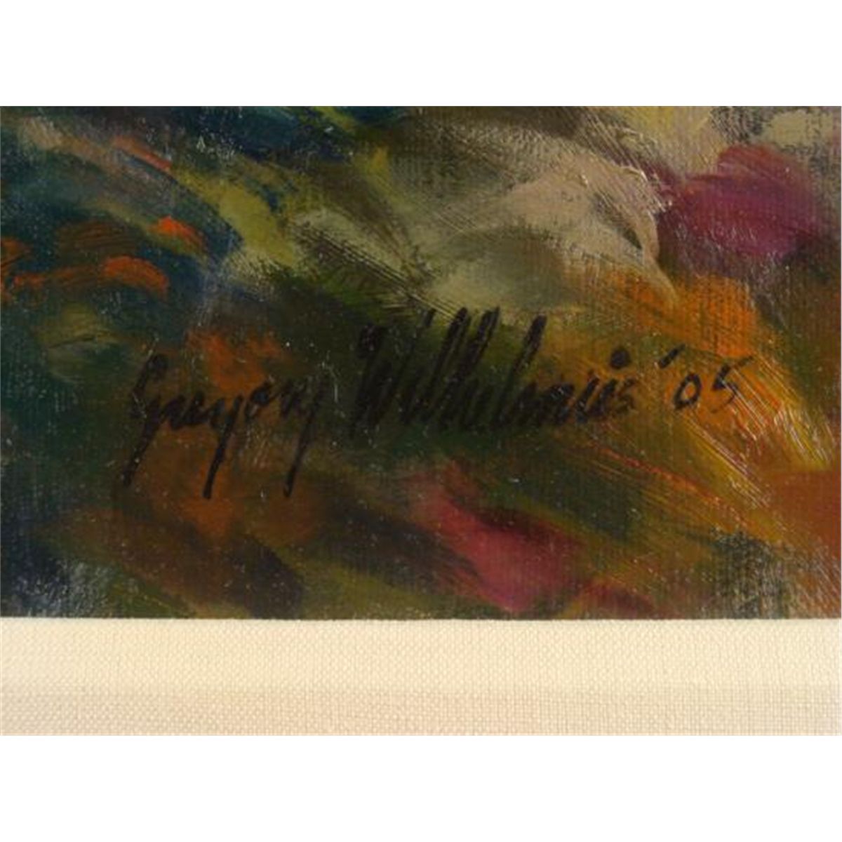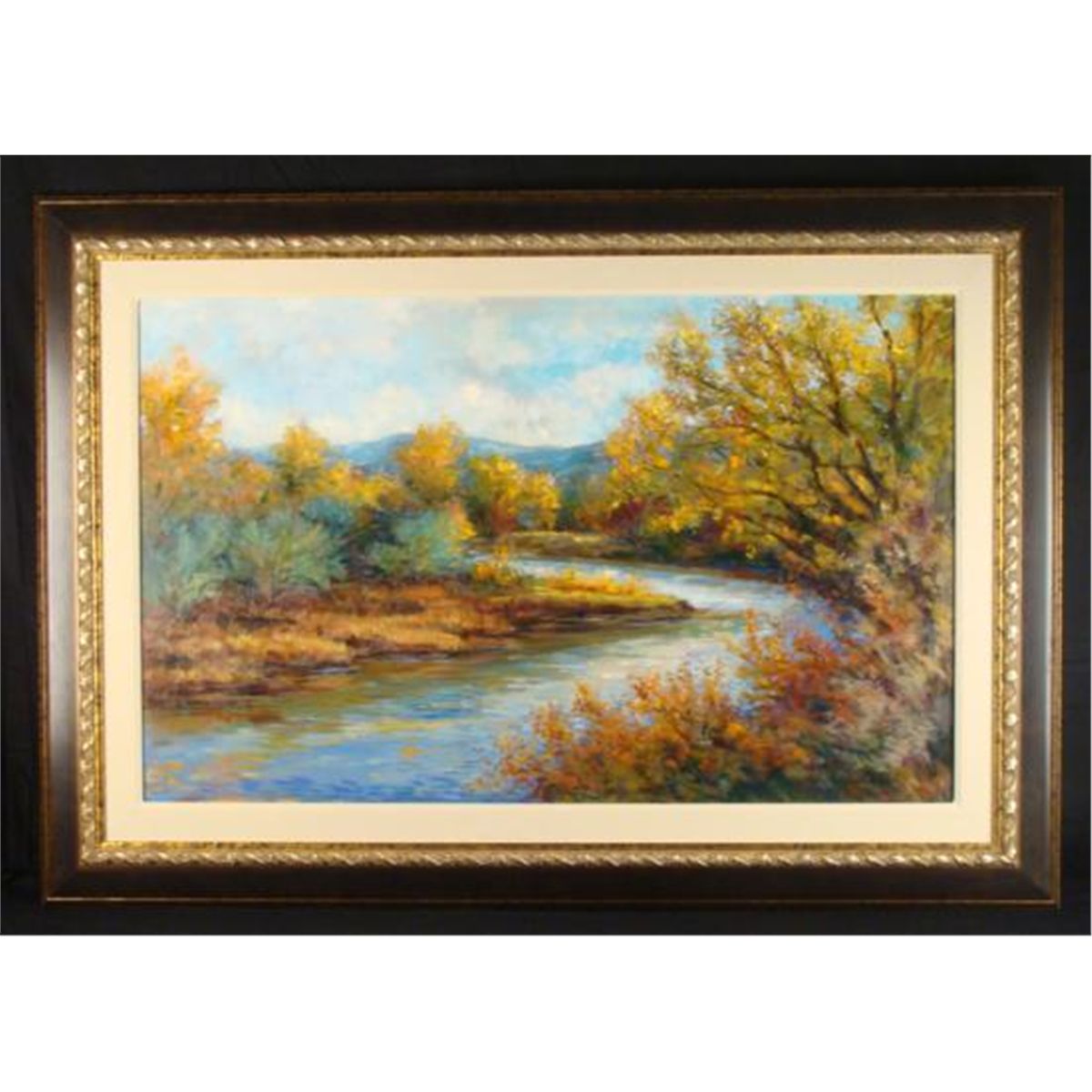 This is a large, original painting by artist Gregory Wilhelm. It portrays a bend in the river at Goulding Creek, in Durango Colorado. The movement of the river is conveyed through the Impressionistic reflections of color, along side the breezy leaves of the autumn trees. Artist: Gregory Wilhelm Title: "River Bend at Goulding Creek" Medium: Original oil on canvas Signed: In paint, lower right Image size: 35 1/2 x 49 1/2 inches Frame size: 46 1/4 x 58 1/2 inches Framing: Custom framed, matted in natural canvas matte, in decorative dark brown and gold wood frame Condition: Excellent Certificate of Authenticity: Included The size of this great original painting lets you feel like you are out on a hilltop, ready to walk right through the passage. *