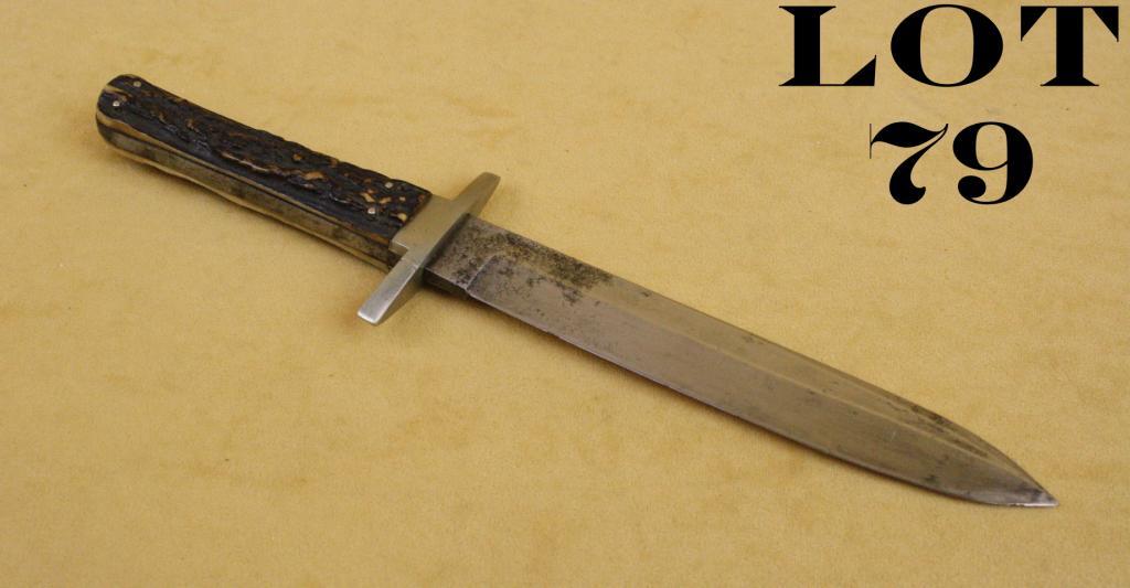 G. Wostenholm & Son Washington Works, Sheffield marked bowie knife approx. 10” overall with an approx. 6” blade marked “I*XL” on the hilt in overall good condition. The blade shows sharp markings and somescattered erosion areas with the majority on the right side hilt area; stag grips; simple cross guard. Est.: $150-$300.