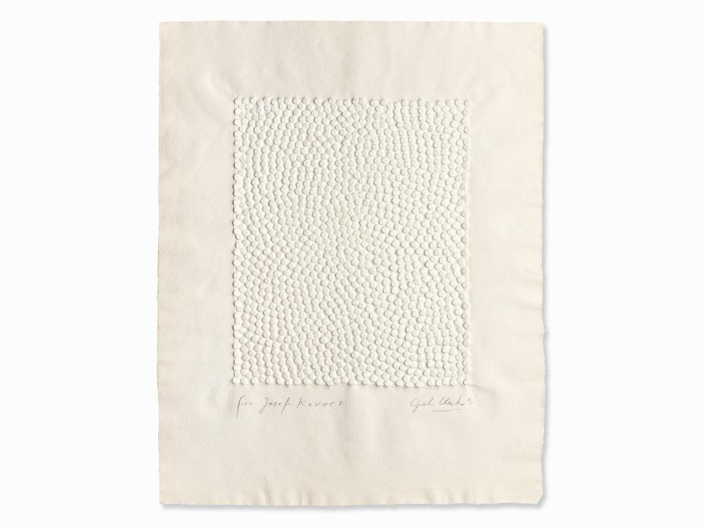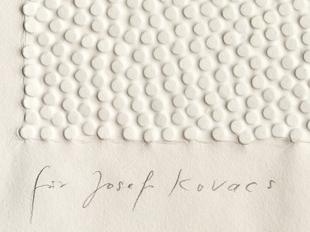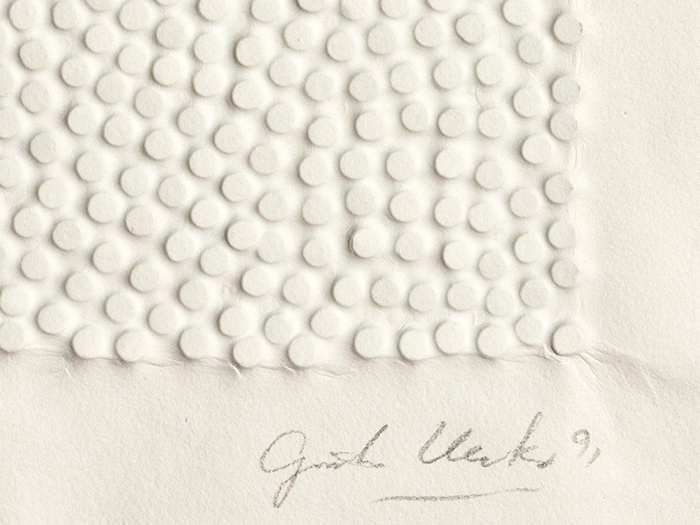 The embossing is signed and dated lower right in pencil ‘Uecker 91’, and dedicated lower left in pencil ‘für Josef Kovacs’. The margins of the sheet are minor unfresh and show occasional unobtrusive creases. The condition is good. The image measures 58 x 47.7 cm, the sheet 98.8 x 78 cm.