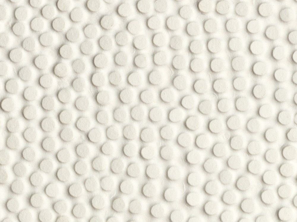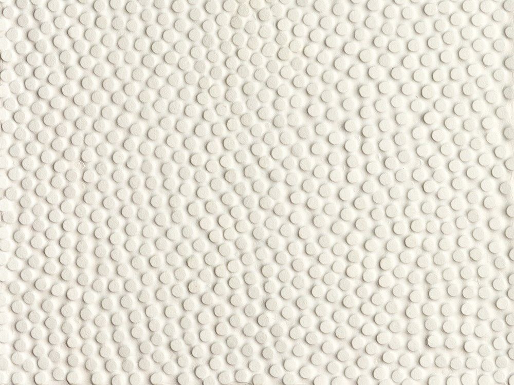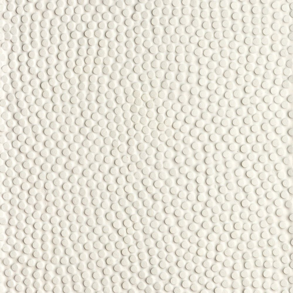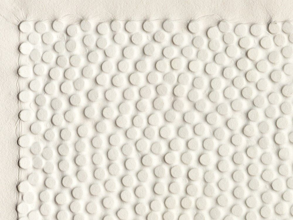 A dense arrangement of strongly embossed nail heads fills the rectangular image area. They create an exciting play of light and shadow, which set the composition in in motion in the eye of the beholder. The hand-made rag paper and the strong embossing, which bring about corrugation in the margins, give the work also a three dimensional character. Therefore, above all, the very clear embossed prints by the artist are especially in demand.