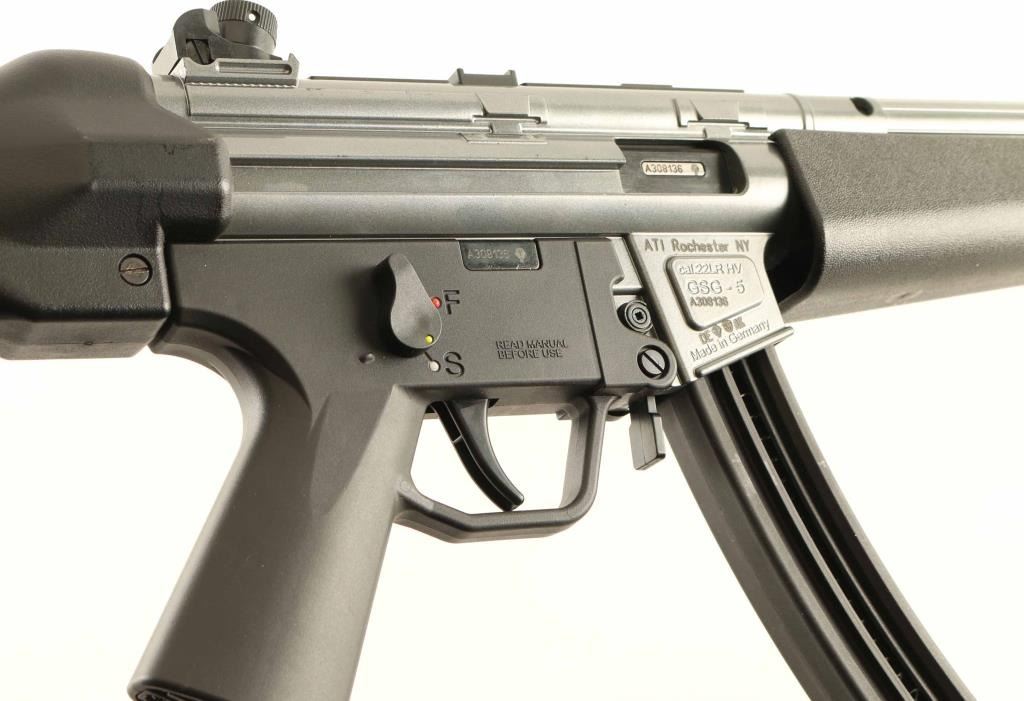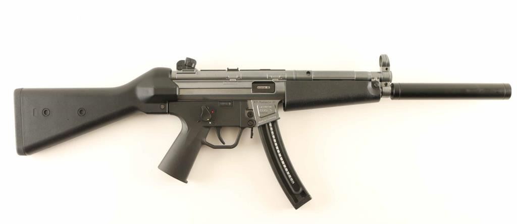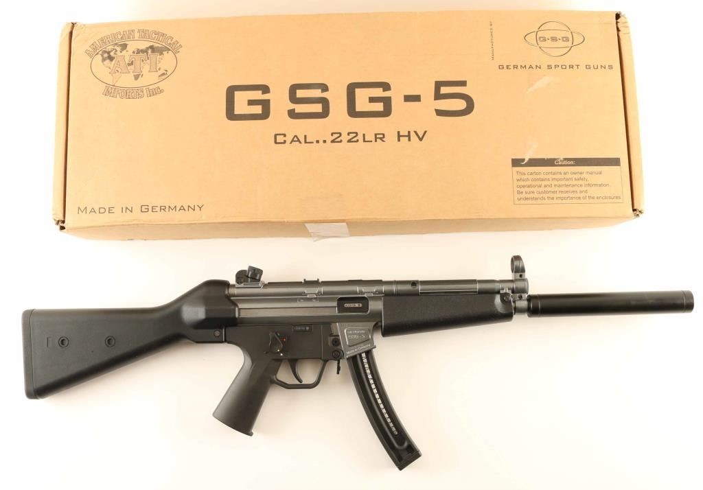 '1st Anniversary GSG-5' German made semi-automatic modern sporting rifle modeled after the iconic HK MP5, manufactured circa 2009. Features a titanium finish, 16.25" barrel with removable faux suppressor, hooded post front sight, 4-position rear drum sight, smooth trigger ambidextrous manual safety, paddle & push button magazine releases, 22 round ProMag magazine, sling points, textured black synthetic forend, black polymer lower receiver with pistol grip and fixed shoulder stock. Includes the original factory cardboard box with manual, lock, cleaning tools and addition front sights. Rifle retains approximately 97% of it's original finish showing some scratches and small scattered losses. Action is smooth, the bore is excellent, and the polymer is fine. Condition is near NRA Excellent in box. ***Modern Firearm***
