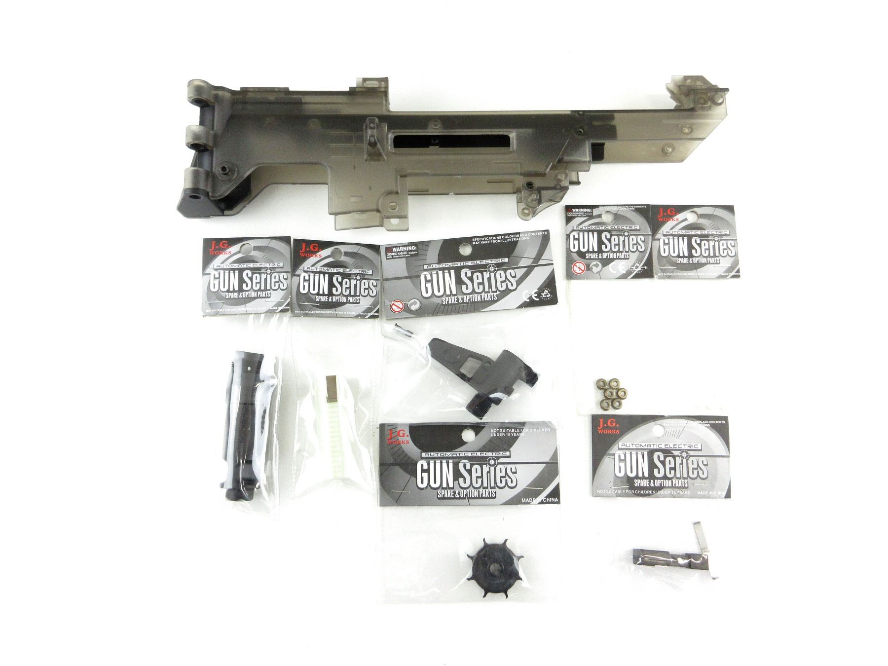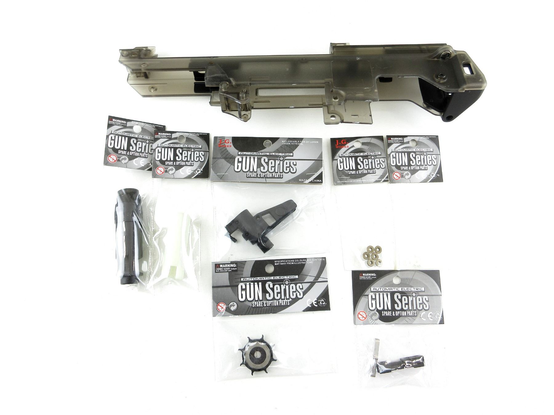 LOT INCLUDES; (1) RIFLE FRAME, GREY TRANSLUCENT POLYMER CONSTRUCTION, (1) PACKAGE OF STAINLESS STEEL AIRSOFT 6MM BRUSHINGS, NOS, UNOPENED, (1) PACKAGE OF WHITE POLYMER AIRSOFT 6MM BRUSHINGS, NOS, UNOPENED, (1) POLYMER PISTON HEAD & TEETH PISTON, NOS, UNOPENED, (1) SAFETY, NOS, UNOPENED, (1) FRONT SIGHT BASE, NOS, UNOPENED, (1) MUZZLE BRAKE, NOS, UNOPENED, ETC. SEE PHOTOS.
