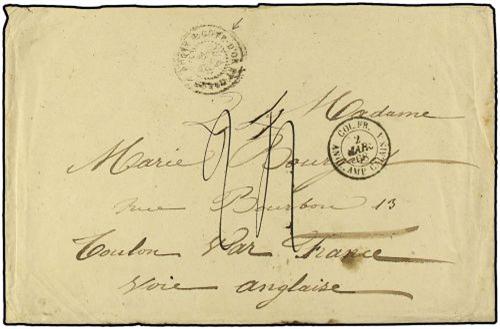 1868 (Feb 1-9) Entire letter with long and interesting contents [twenty pages] from the Gabon to Toulon endorsed ´Voie Anglaise´. COTE D´OR cds at top of stampless cover, ´Col Fr.Ang.Amb.Calais´ cds on front [March 2] and arrivals on reverse. Charged 24 decimes due in manuscript. A rare and complete entire.