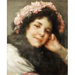 “Frohe Stunde”. Frauenporträt mit Blumenkranz in den Haaren. Oel auf Leinwand. - <U>Signiert</U> und betitelt sowie verso mit altem biographischem Text. Größe: 35 x 28,5 cm. “Von 1863-1867 studierte Max an der Münchner Akademie bei Karl Theodor von Piloty zusammen mit Hans Makart und Franz von Defregger...Innerhalb der Piloty-Schule gehörte G. von Max zu den Interessantesten, weil er die gründerzeitliche Thematik von Genre und Historie hinter sich ließ und zu allegorisch-mystischen Bildlösungen gelangte, wie sie für die Sezessionskunst typisch wurde” (Bruckmann, Münchner Maler im 19. Jhdt., Bd. 2, S. 305). Gerahmt.