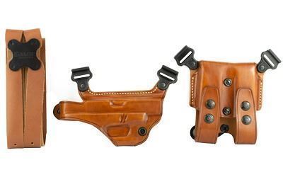 Galco's Miami Classic(TM) is quite possibly the most imitated shoulder holster system in the world. A direct descendant of the original shoulder system first introduced by Galco in 1970 (then the Famous Jackass Leather Company), the Miami Classic has since become the favorite of professionals worldwide. A key component of this shoulder system is its spider harness. All four points of the spider harness pivot independently and are connected by their unique clover shaped Flexalon(TM) swivel back plate, which is a Galco trademark. This results in a perfect fit and lasting comfort for all sizes and shapes. This system is constructed of premium saddle leather and includes holster, harness, ammo carrier and a set of system screws. The Miami Classic is fully modular and is made for semiautomatic pistols and some revolvers.