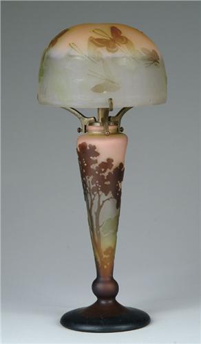GALLE BUTTERFLY LAMP. Beautiful cameo lamp has scenic forest design on base with green and brown trees against a pink shading to frosted background. Dome shaped shade is encircled by cameo butterflies in flight. The butterflies are done against a pink shading to frosted background. Signed in cameo "* Galle". SIZE: 15-1/2 in. t. CONDITION: Very good to excellent. 5-60827