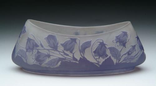 GALLE CAMEO BOWL. Wonderful Galle boat shaped bowl has beautifully detailed lilac cameo flowers and leaves against a frosted background. Signed on the side in cameo "Galle". SIZE: 10-1/2 in. l x 4 in. t. CONDITION: Very good to excellent. 5-61351