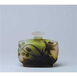 Lot 855 GALLE CAMEO SCENT BOTTLE. Beautiful Galle bottle has green cameo leaves, vines and berries against a green, pink and cream background. Bottle has plain frosted stopper. Signed on side in cameo "Galle". SIZE: 3-1/2" t x 4" w. CONDITION: Some minor fleabites on outside of lip, otherwise very good. 5-68792 (800-1,200)