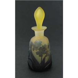 Lot 1268 GALLE CAMEO SCENT BOTTLE. Beautiful scent bottle has purple to blue cameo flowers and leaves against a yellow frosted background complete with frosted yellow stopper. Signed on the side in cameo “Galle” and carrying the original “Galle” paper label on the bottom. SIZE: 5-1/4” t. CONDITION: Tiny fleabite to signature, otherwise very good to excellent. 5-69771 (800-1,200)