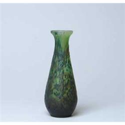 Lot 917 GALLE CAMEO VASE. Unusual Galle vase has olive green cameo leaves and vines against a green and blue speckled background. Signed on side in cameo "Galle". SIZE: 8" t. CONDITION: Very good to excellent. 5-68857 (1,000-1,500)
