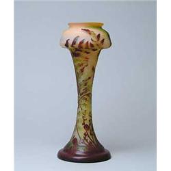 Lot 1104 GALLE CAMEO VASE. Very interesting large Galle vase has rich reddish-brown foot extending to cameo leaves and stems over green cameo leaves against a cream to peach background. Reddish-brown glass is cut to highlight the green leaves further up the stem and is done to appear almost like enameling. Signed on side with etched signature "Galle". SIZE: 13-1/2" t. CONDITION: Very good to excellent. 5-68808 (1,800-2,200)
