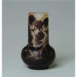Lot 1259 GALLE CAMEO VASE. Wonderful Galle vase has a multitude of brown cameo leaves and flowers against a frosted background of cream, pink and yellow. Leaves and flowers are very nicely detailed. Signed on side in cameo "Galle". SIZE: 5-3/4" t. CONDITION: Very good to excellent. 5-68805 (600-900)