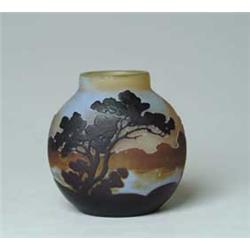 Lot 1264 GALLE CAMEO VASE. Galle vase has cameo scenic decoration in brown to white against an amber colored background. Signed on side in cameo "Galle". SIZE: 4-3/4" t. CONDITION: Small area of grind marks near foot, otherwise very good. 5-68868 (600-900)
