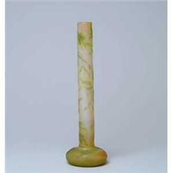 Lot 1265 GALLE CAMEO VASE. Galle stick vase has two color green leaves, stems and seedpods against a peach and cream background. Signed on foot in cameo "Galle". SIZE: 11-1/4" t. CONDITION: Very good to excellent. 5-68899 (2,000-2,500)