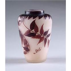 Lot 556 GALLE CAMEO VASE Very nice Galle vase has plum colored leaves, branches and seedpods descending from around the rim.  The nicely detailed cameo carving is set against a frosted pale mauve background.  Signed on side in cameo “Galle”.  SIZE:  7-3/4” t.  CONDITION:  Line of color inside neck at first appears as crack, but is just strictly a line in the making.  Very good to excellent.  5-70246