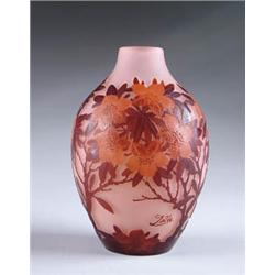 Lot 558 GALLE CAMEO VASE Very pretty rouge and crimson floral and foliage pattern on pink background. Signed “Galle”. SIZE: 11-1/2” t. CONDITION: Very good to excellent. 5-70594