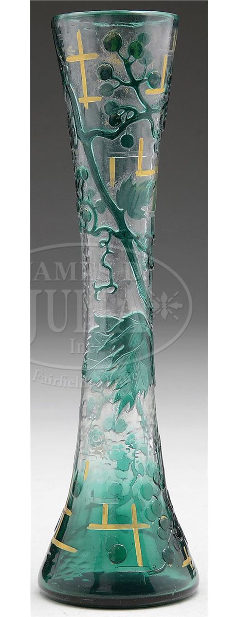 Interesting Galle vase has green cameo Grapevine leaves and grapes set against a clear crystal background. The background is further decorated with wheel-carved martele decoration, as well as gilt highlights depicting a trellis. The vase is ornately signed on the underside with cameo grape leaf decoration and etched "Emile Galle Modele et decor deposes G.G.". SIZE: 11-1/4" t. CONDITION: Very good to excellent. 5-66689