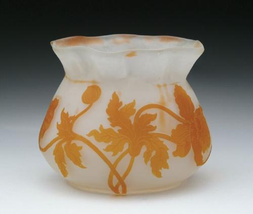 GALLE CAMEO VASE. Wonderful Galle vase has orange nicely detailed cameo flowers, leaves, vines and buds against a frosted background. Flaring lip of vase is lightly ruffled. Signed on the side in cameo with nice stylized signature "Galle". SIZE: 4-3/4 in. t x 5 in. dia. CONDITION: Very good to excellent. 5-61346