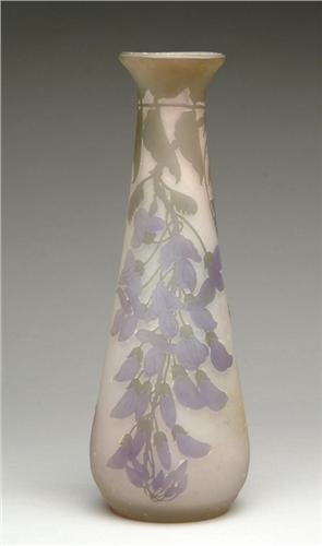 GALLE CAMEO VASE. Beautiful Galle vase has lavender colored flowers hanging from vines of green leaves descending from the top. Signed on the side in cameo "Galle", next to a flower which has fallen from the vine and is drifting to the ground. SIZE: 12 in. t. CONDITION: Very good to excellent. Collection of Dr. C. and Margaret Chastain 5-61542