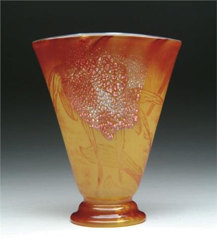 GALLE CAMEO VASE. Beautiful Galle fan shaped vase features cameo decoration of iris blossoms and leaves in colors of brown and citron with silver foil decoration. Signed "Cristallerie de Galle Nancy". SIZE: 9 in. t x 7 in. w. CONDITION: Very good to excellent. 5-60642