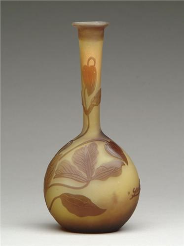 GALLE CAMEO VASE. Beautiful Galle vase has nicely detailed brown cameo leaves and flowers against a frosted yellow background. Signed on the side in cameo "*Galle". SIZE: 7 in. t. CONDITION: Very good to excellent. Collection of Dr. C. and Margaret Chastain 5-61428