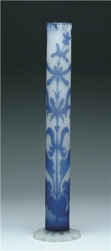 GALLE CAMEO VASE. Tall cylindrical vase has blue cameo stylized flowers and leaves extending the length of the vase. Top of vase is lightly ruffled as well as the applied frosted foot. Signed on the side in cameo with a stylized signature "Galle". SIZE: 15-3/4 in. t. CONDITION: Very good to excellent. 5-61096