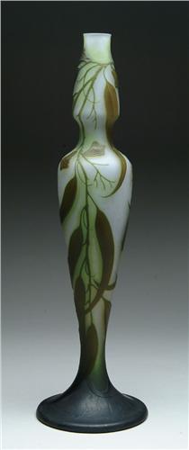 GALLE CAMEO VASE. Tall Galle vase features cameo decoration of green leaves and blossoms on a frosted white background. Signed on the foot of vase "Galle*". SIZE: 20-1/2 in. t. CONDITION: Very good to excellent. 5-60736