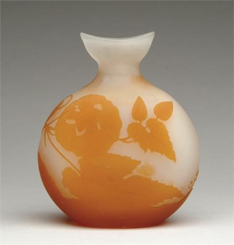 GALLE CAMEO VASE. Very nice Galle vase has orange cameo flowers and leaves against a frosted background. Signed on the side in cameo "*Galle". SIZE: 6 in. t. CONDITION: Very good to excellent. Collection of Dr. C. and Margaret Chastain 5-61427