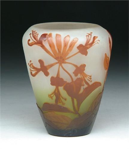 GALLE CAMEO VASE. Cameo decoration features a raisin colored floral blossoms and leaves on a green and clear frosted background. Signed on side of vase "Galle". SIZE: 4 in. t. CONDITION: Very good to excellent. 5-60628