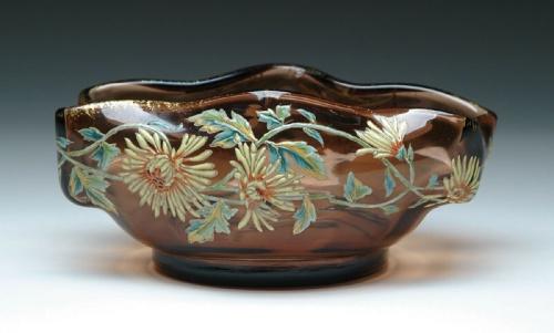 GALLE ENAMELED BOWL. Outstanding early Galle bowl has heavily enameled crysanthamums against a brown transparent glass background. Signed on the underside "E. Galle Nancy Depose". SIZE: 8-1/2 in. w x 6-1/2 in. deep. CONDITION: Very good to excellent. 5-61085