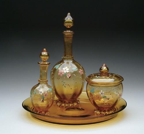 GALLE ENAMELED CONDIMENT SET. Very fine condiment set consists of two stoppered decanters and covered jar on matching tray. Decanters and jar are beautifully enameled with flowers and leaves in pink, white, maroon and turquoise against a ribbed amber glass background. Each piece has an applied ruffled foot. Signed on the underside in gold "E. Galle Nancy". SIZE: Tray: 12 in. dia. Tallest decanter: 11-1/2 in. t. CONDITION: Some minor staining to interior of large decanter, otherwise very good to excellent. 5-61237