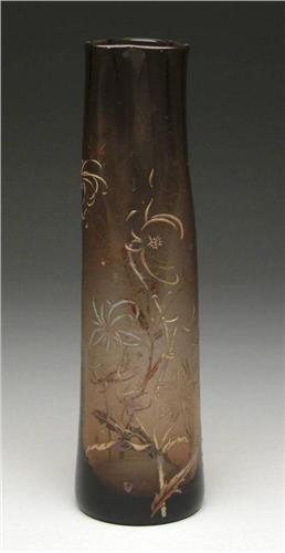GALLE ENAMELED VASE. Enamel and carved decoration of flowers and leaves on a transparent brown glass. Signed on underside "E. Galle". SIZE: 14" t. CONDITION: Very good to excellent. 5-61957