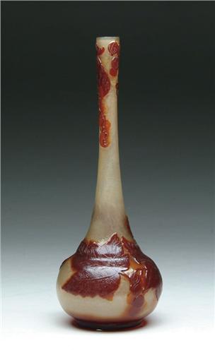 GALLE FIREPOLISHED STICK VASE. Cameo decoration of raisin colored grapes and leaves on a beige background. Signed with cameo relief on neck "Galle". SIZE: 10 in. t. CONDITION: Very good to excellent. 5-60647