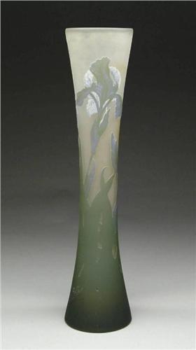GALLE FRENCH CAMEO VASE. Unusual three-color pea green, lavender and white iris flowers on frosted to orange background. Acid-etched signature on side of vase "Galle". SIZE: 22" t. CONDITION: Nicks to foot rim otherwise very good. 5-62477