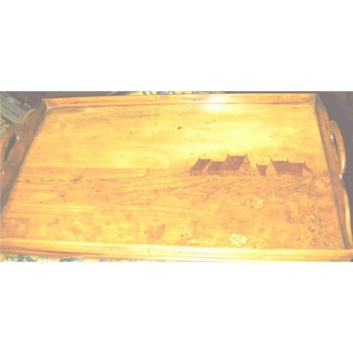 The marquetry image of the village and the sea image is clear but in a couple of places the wood is slightly stained, and in two or three places there is very minor imperfection resulting probably from tea spilt onto the tray. However though slightly raised everything is there.