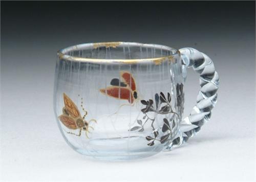 GALLE MINIATURE CUP. Rare early Galle miniature has enameled leaves and stems with two beautifully enameled flying insects on the side. The clear glass cup is further decorated with lightly etched veining running vertically around the cup. The applied handle is twisted clear glass. SIZE: 1-1/4 in. t. CONDITION: Very minor wear to gilt trim on lip, otherwise very good to excellent. 5-61235