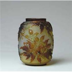 Lot 1003 GALLE MOLD BLOWN VASE. Truly outstanding Galle vase has mold blown flowers and leaves in rich brown and green glass against a frosted background. Signed on the shoulder in relief "Galle". SIZE: 9-1/4" t. CONDITION: Very good to excellent. 5-70117 (4,500-5,500)
