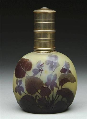 GALLE PERFUME LAMP. Beautifully decorated Galle perfume lamp has purple floral and foliage pattern on a vivid yellow background. Signed “Galle” in cameo. SIZE: 6-1/2” t including hardware. CONDITION: Very good to excellent. 8-87369
