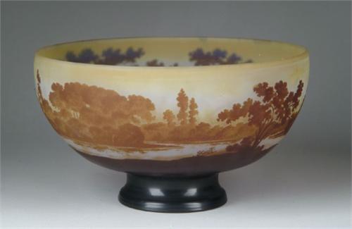 GALLE SCENIC BOWL. Magnificent large Galle bowl is surrounded by brown cameo scenery of trees and water against a mottled yellow and frosted background. Bowl is signed on the side in cameo "Galle". SIZE: 11 in. dia x 6-1/2 in. t. CONDITION: Very good to excellent. 5-60612