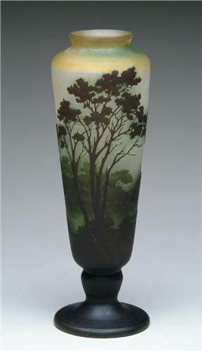 GALLE SCENIC VASE. Very nice Galle vase has cameo scenic designs of forest with opening of river or pond with two small boats at dock. The olive green and light green forest design is done against a frosted background shading to tangerine at the shoulder. Signed on the side in cameo "Galle". SIZE: 13 in. t. CONDITION: Very good to excellent. 5-61350