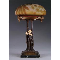 Lot 545 GALLE SHADE ON AUSTRIAN BASE Lamp begins with a French cameo shade having an Art Nouveau leaf and berry design in earthen hues. The shade is supported by a figural base depicting a semi-nude woman in ivory and bronze. Shade is signed “Galle”. Base is signed “R. TERCESZEZUK”. SIZE: 16” t. CONDITION: Shade is good with minor scratches. Base is very good to excellent. 5-70530