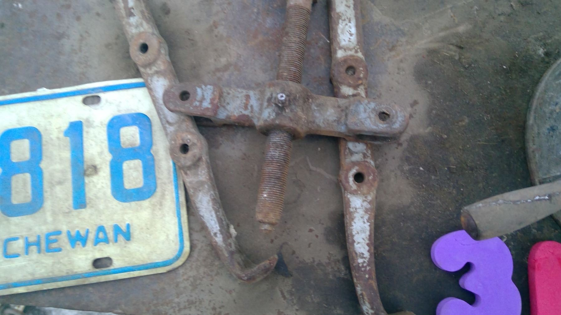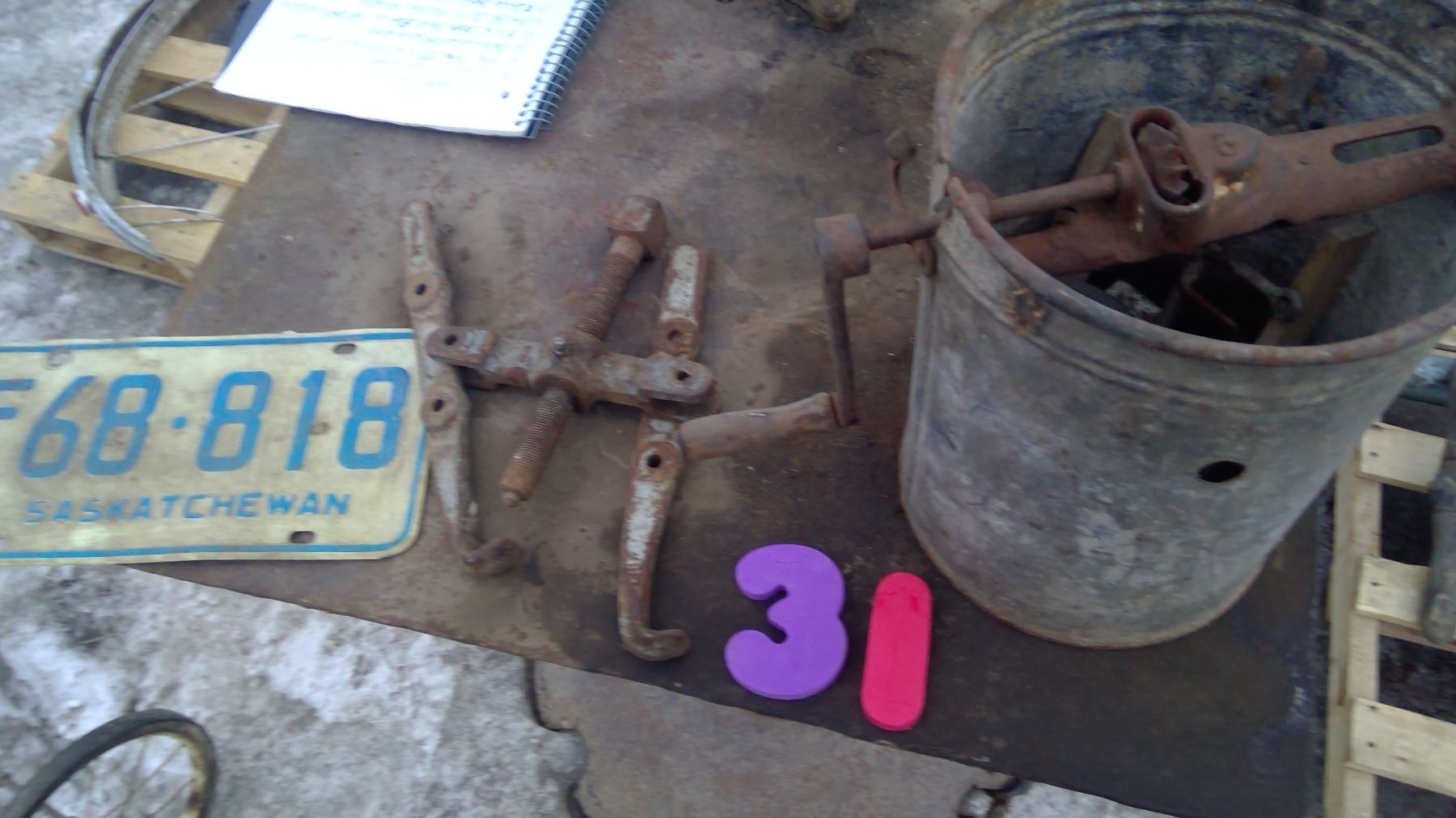 GALVANIZED BUTTER CHURN, TWO JAW PULLER, 1976 FARM PLATE