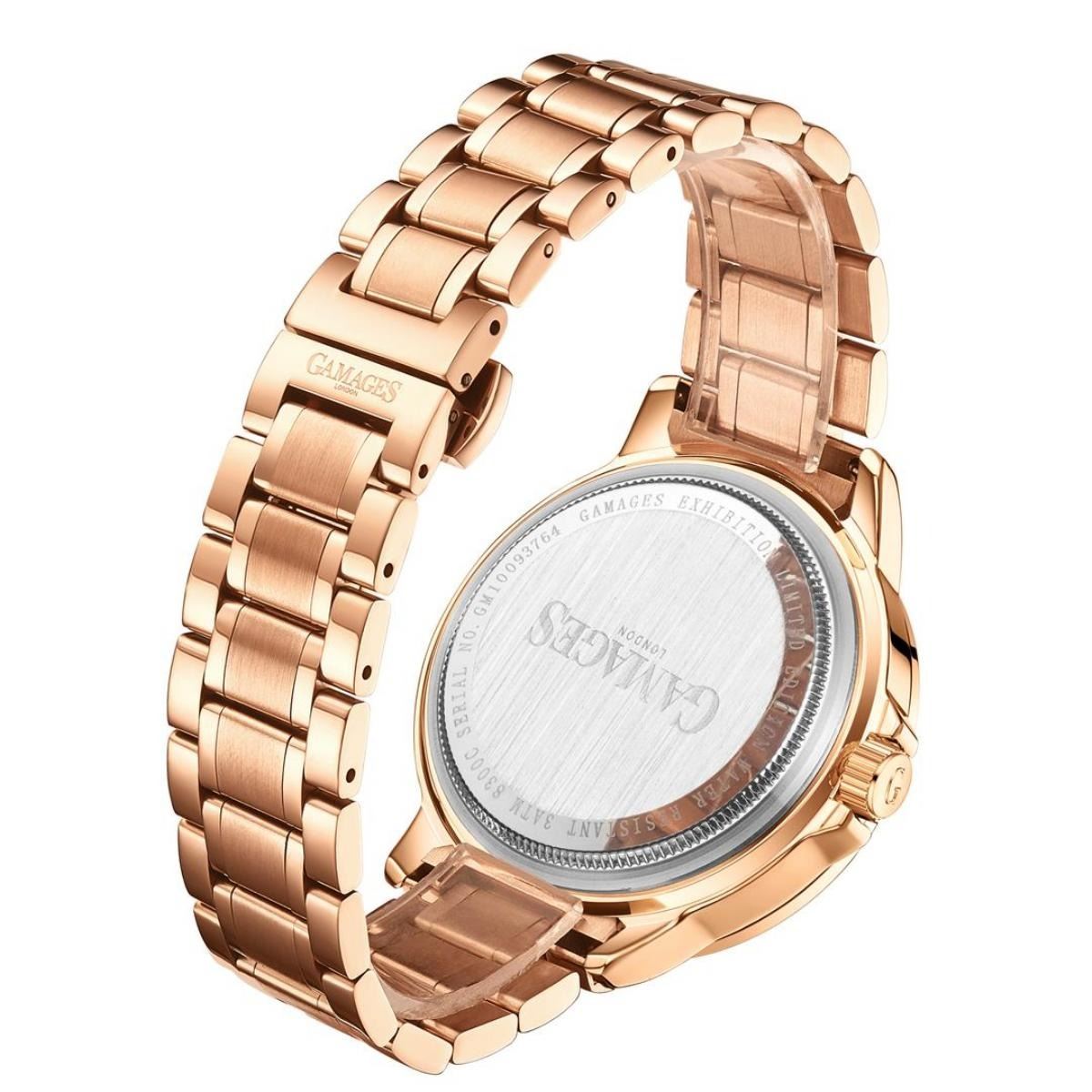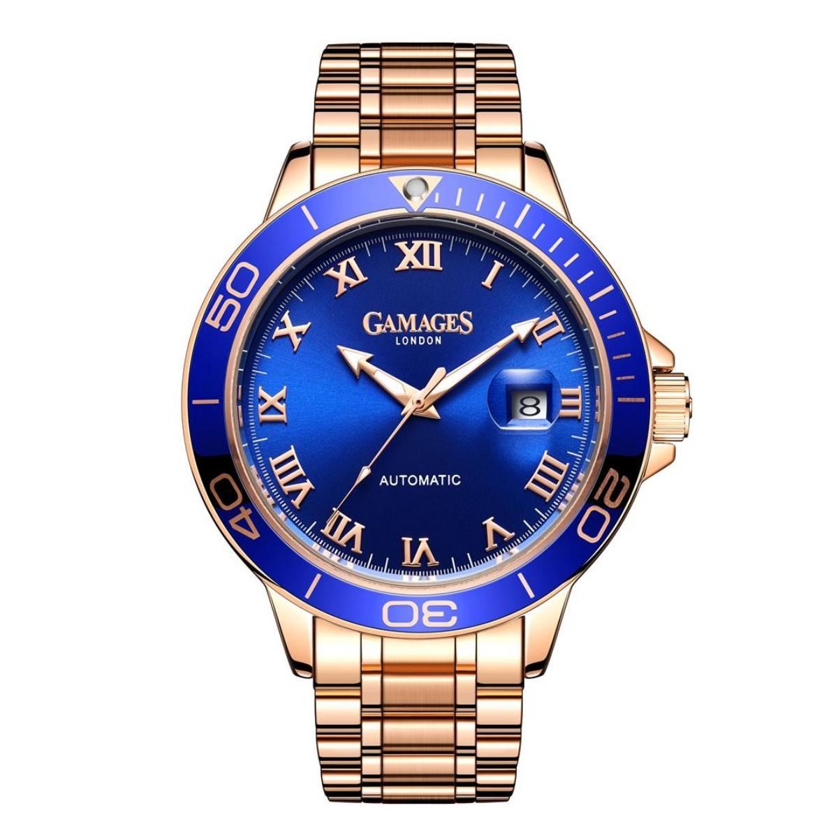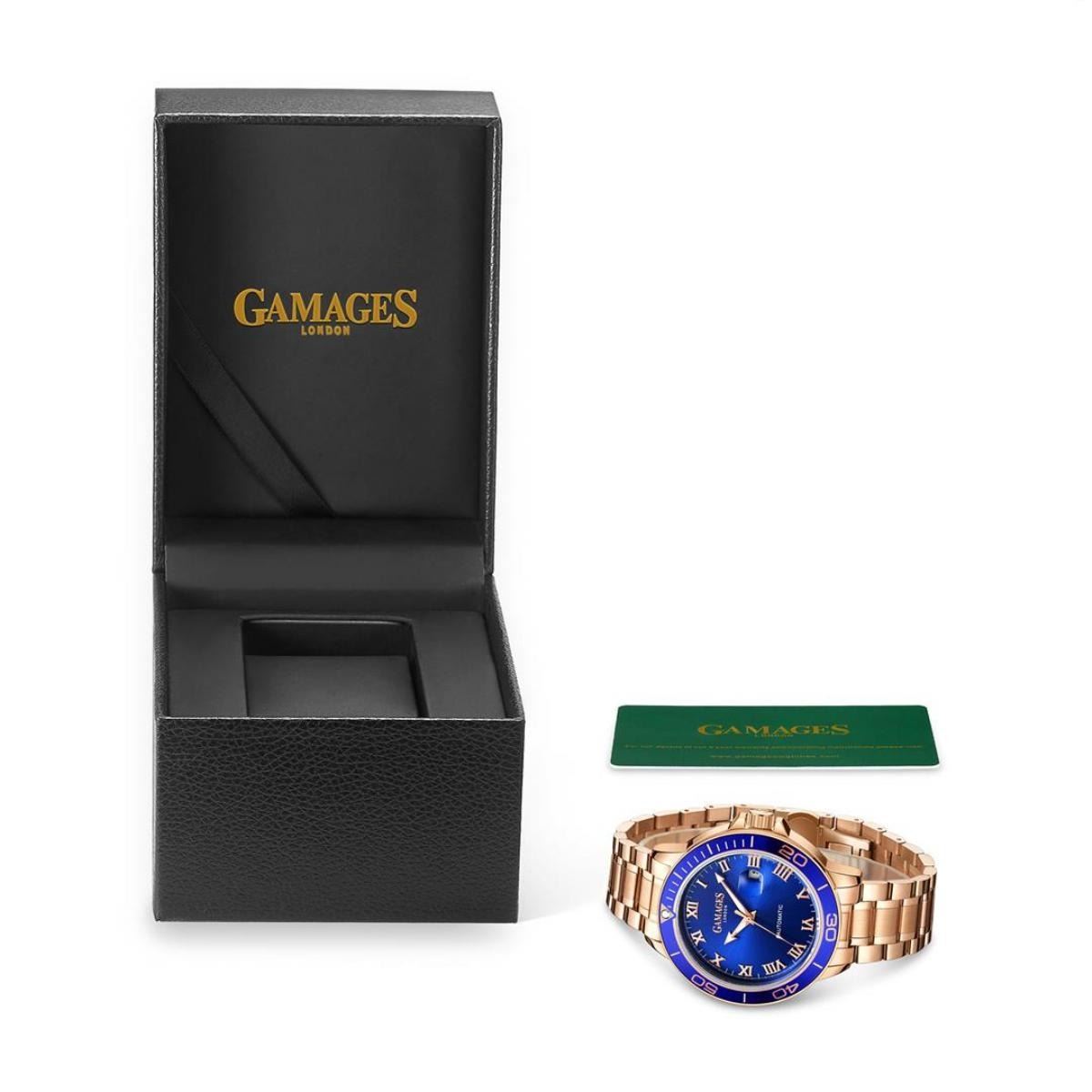 Gamages is a brand with a long heritage and a strong commitment to showcasing the very best of British institutions, history and individuals through the ages. The Heraldic Exhibition Automatic Watch takes its design inspiration from one of the most fascinating aspects of British history - chivalric heraldry. Azure was a shade of blue that was one of the original five authentic heraldic colours. This exquisite watch reflects this heritage in its stylish blue face which is paired perfectly with contrasting hands, magnified date window, and diamond cut indices with traditional Roman numerals that only enhance the classic styling of this beautifully designed timepiece. With 182 part 20 jewel automatic movement and a rotating bezel, the sophisticated Heraldic watch is assembled by hand and boasts a stainless steel strap in gold as well as a stainless steel caseback with the Gamages logo etched into it to add the perfect finishing touch. All GAMAGES timepieces are finished with an individual serial number and comes with a 5-year warranty. Model Specifications - Hand Assembled 182 Piece 21 Jewel Automatic Movement - Stainless Steel Case Back With Gamages Etched Logo - Magnified Date Window - Rotating Bezel - Luminous Hands - Scratch Resistant Mineral Glass - Water Resistant 3ATM - Stainless Steel Bracelet - Shock Resistant - Antimagnetic - Nickel Free & Hypoallergenic - IP Plating Watch Dimensions - Case 45mm - Thickness 15mm - Strap Width 20mm - Strap Length 220mm - Lug Width 20m - Weight 159g