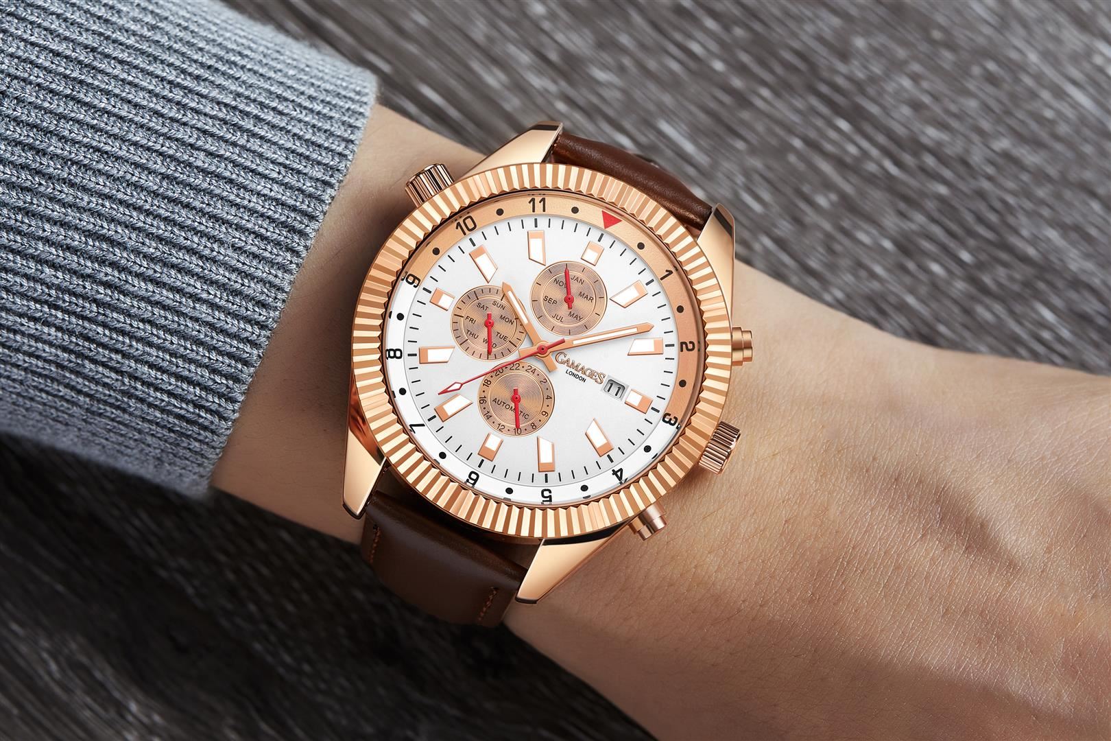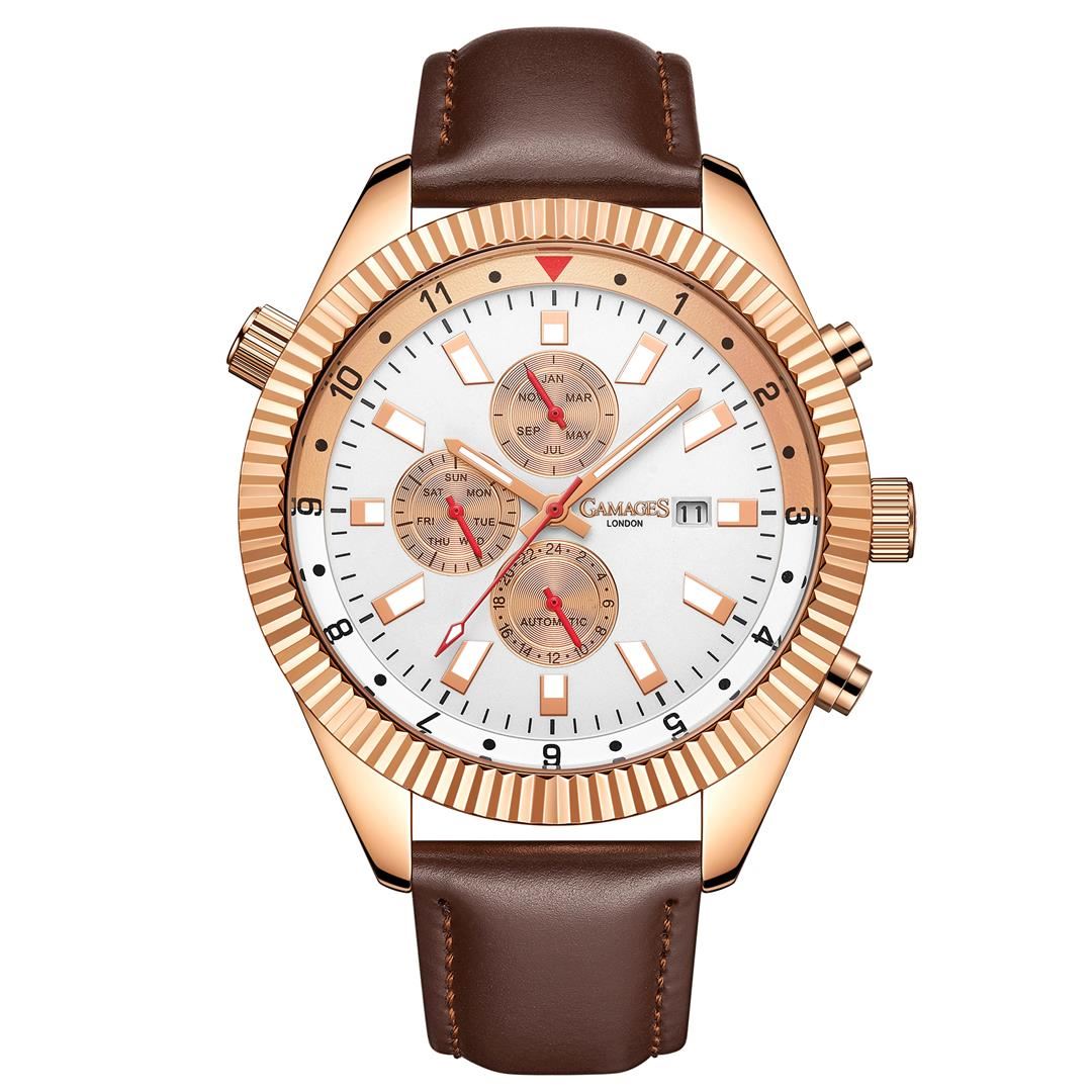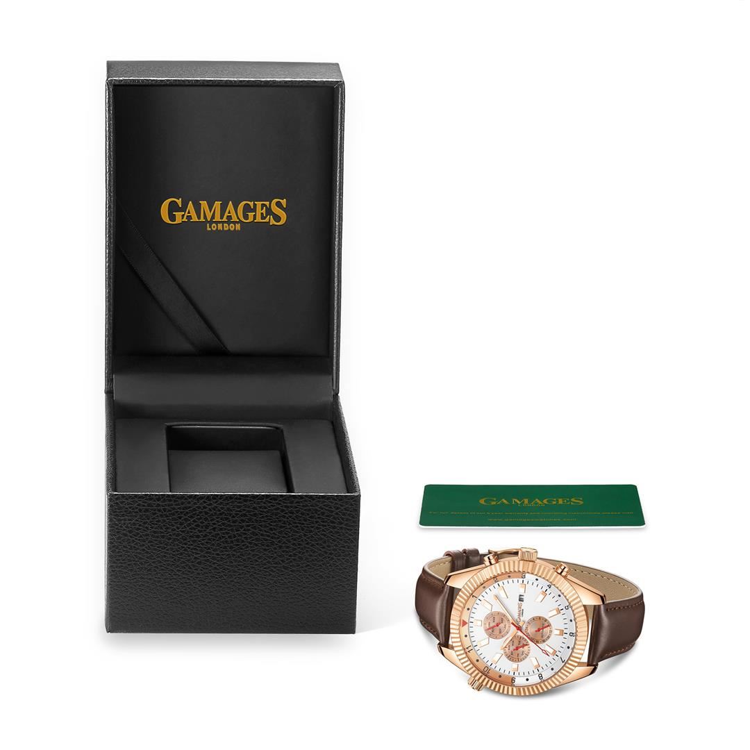 Whether gold, coal, or iron ore, mining will forever have a place in British history. The Gamages Hour Rotator men's watch reminds us of such a tradition and promotes the affluence you can only find when you're willing to explore deep under the Earth's surface. It consists of a 163 part 20 jewel hand assembled movement that is inspired by the intricate solutions required for every venture beneath. Bordered by an inner-rotating bezel, the Day, Date, Month and 24-Hour functions conjure images of the neverending grit that makes the man, and the rose gold casing to match the blade-like hands, which push regal scenes of determination to the forefront of your mind. These parts are contained within the solid stainless steel caseback with the Gamages logo engraved. The first layer hand waxed umber brown leather strap, complete with Gamages logo buckle, leaves a final lasting impression. With the history of mining, it is understood that the work never stopped, and while the nation doesn't rely on it as it once did, this watch reminds us of the consistent work that went into building Britain. Model Specifications - Hand Assembled 163 Piece 20 Jewel Automatic Movement - Stainless Steel Case Back With Gamages Etched Logo - Day, Date & Month Functions - 24 Hour Timer - Luminous Hands - Inner Rotating Hour Bezel - Scratch Resistant Mineral Glass - Water Resistant 3ATM - Hand Waxed Tobacco Brown Leather Strap - Shock Resistant - Antimagnetic - Nickel Free & Hypoallergenic - IP Plating Watch Dimensions - Case 48mm - Thickness 14mm - Strap Width 22mm - Strap Length 220mm - Lug Width 22mm - Weight 94g
