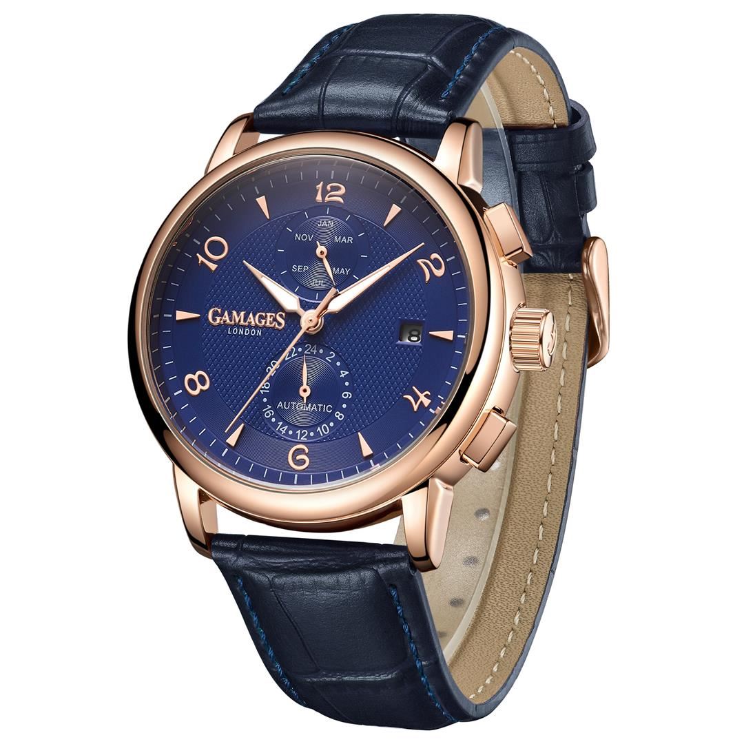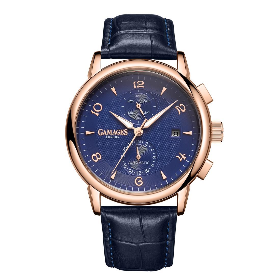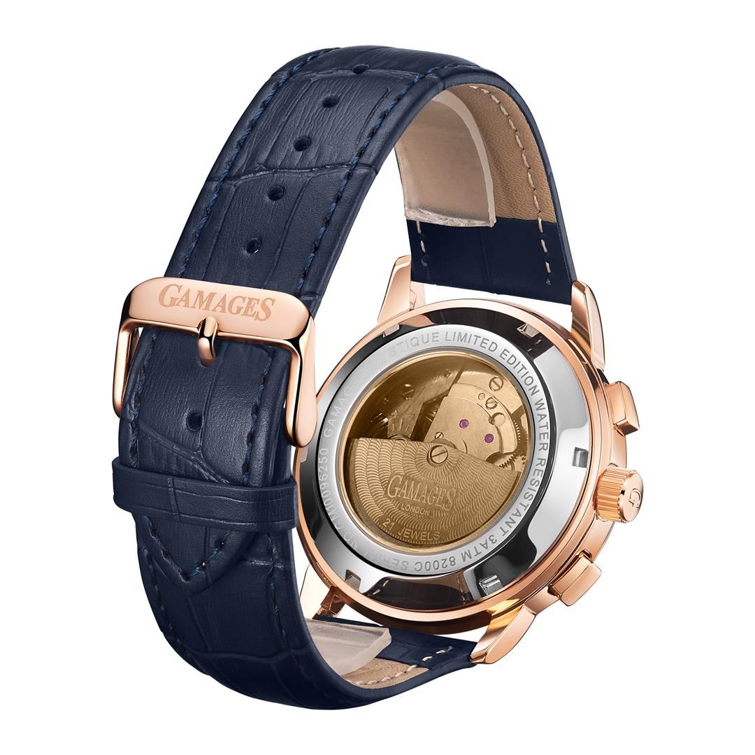 Mysteries have always intrigued the Great British Public, and the Gamages Mystique Automatic encompasses the secrets that often lie under our noses. It is inspired by the Prince of Paradox GK Chesterton, who captured the imaginations of readers throughout their lifetime, and it is a testament to the quality that such works are still beloved today. With a cool indigo blue face that blends in wonderfully with a hand waxed leather strap, the Gamages Mystique Automatic inspires images of contradictory twilight secrets emerging from the shadows. It is complemented by sharp minute and hour hands, representing the eye for detail of our favorite detectives, and it operates with 163 part 20 jewel hand assembled movements along with Day, Date, and 24 Hour functions. These guide you to the clues and reveal the solution that, once uncovered, seems so obvious. It is housed in a rose gold casing with a stainless steel tinted skeleton caseback that harks back to the suggestion that Chesterton could be considered the Forefather of Steampunk. Much like our favorite mysteries, such a design delivers the satisfaction that all great detectives spend their lives searching for. Model Specifications - Hand Assembled 163 Piece 20 Jewel Automatic Movement - Tinted Full Skeleton Stainless Steel Caseback - Day, Date & 24 Hour Functions - Scratch Resistant Mineral Glass - Water Resistant 3ATM - Hand Waxed Leather Strap - Shock Resistant - Antimagnetic - Nickel Free & Hypoallergenic - IP Plating Watch Dimensions - Case 43mm - Thickness 15mm - Strap Width 22mm - Strap Length 220mm - Lug Width 22m - Weight 78g