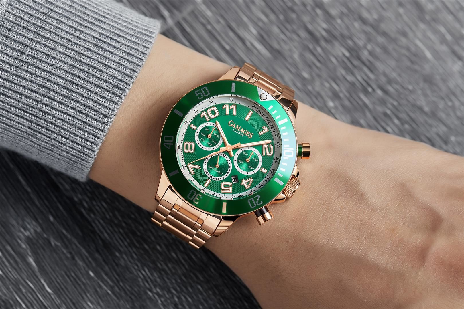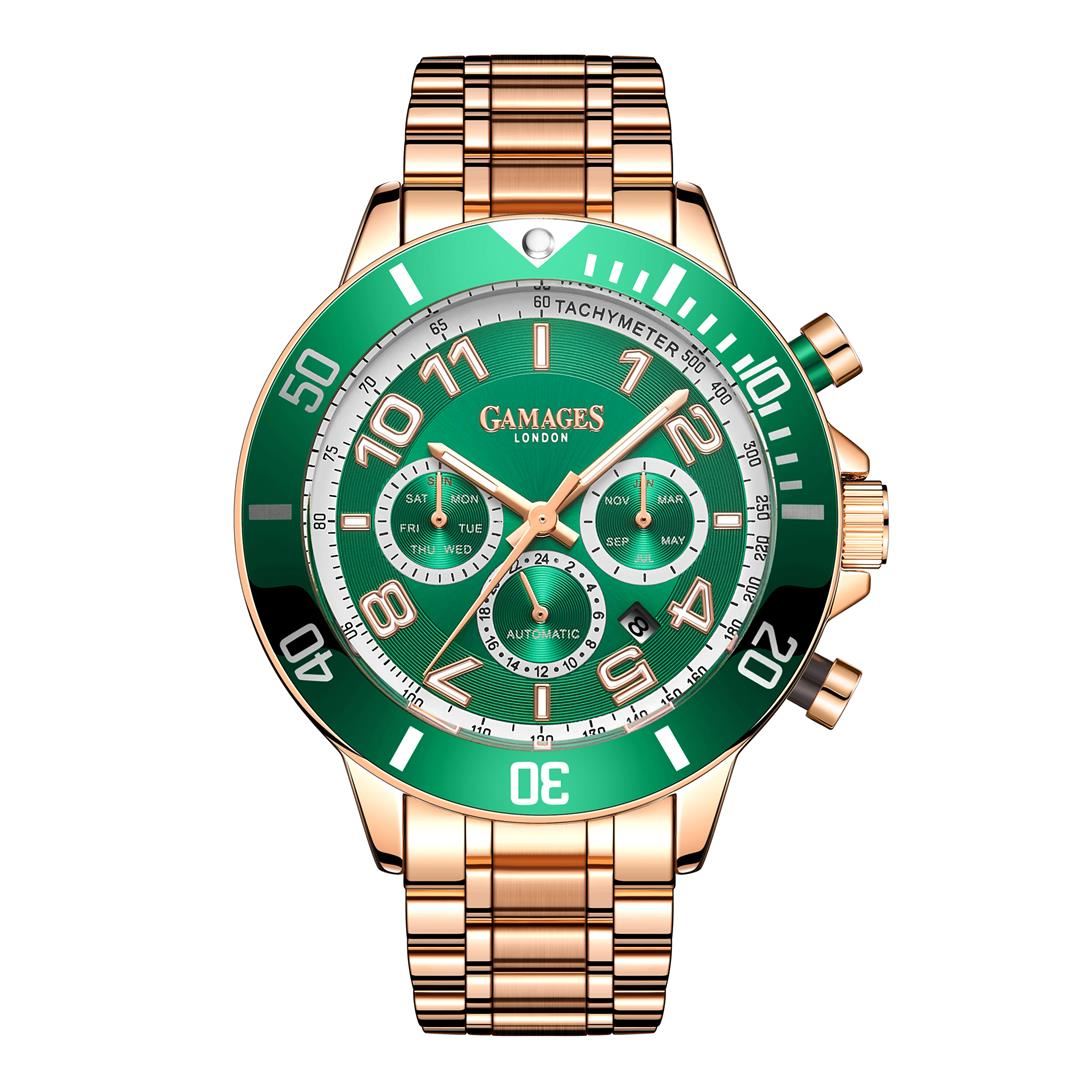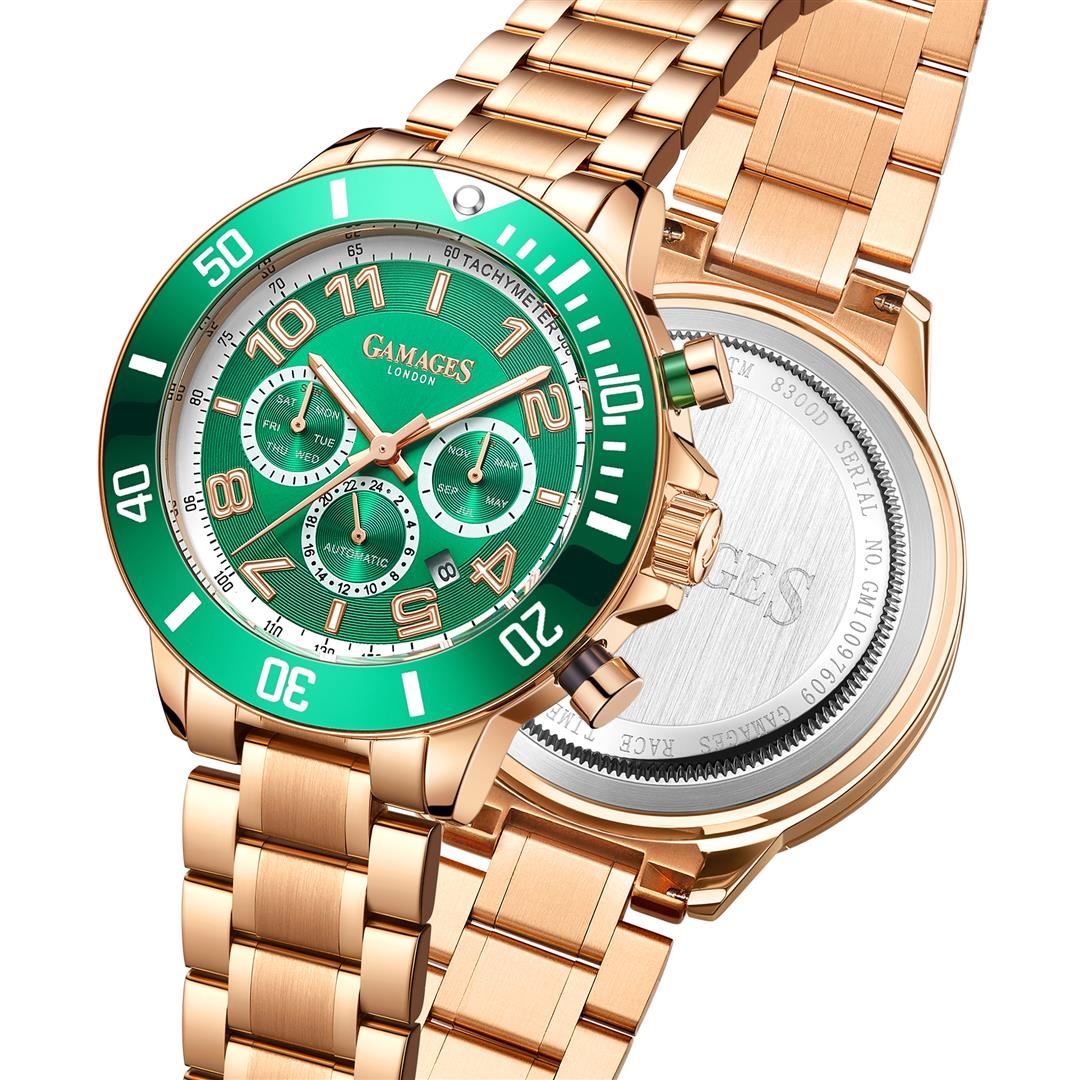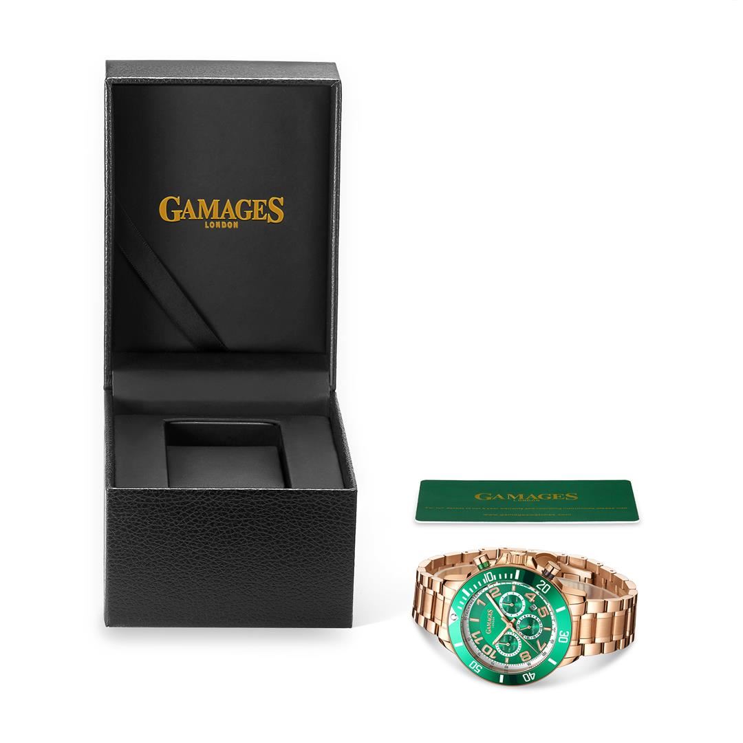 Since 1902 and the debut of Selwyn Edge's winning Napier, British Racing Green has been synonymous with the fast-paced precision of the Grand Prix. The Gamages Of London Limited Edition Hand Assembled Race Timer Automatic men's watch celebrates this tradition. Hand assembled 163 part 20 jewel automatic movement and Day, Date, Month and 24 hour function provide accuracy and reflect the precision required to round the tightest corners. The inner ring, a white tachymeter, judges speed, distance and time, which is essential for any racing driver's success on the track. The Arabic numbers are unique compared to the traditional markers, and they nestle comfortably around the dial that is surrounded by a rotating minute timer bezel. Outside, the Gasket rings match the green dial, and are reminiscent of the famed colours that follow every British competitor when they climb into the driver's seat. The logo engraved stainless steel caseback and rose-gold bracelet with logo buckle complete the watch. Hypnotising in its endless loops, the Grand Prix reflects the importance of time and precision in ways that many other vocations cannot grasp. Model Specifications - Hand Assembled 163 Piece 20 Jewel Automatic Movement - Stainless Steel Case Back With Gamages Etched Logo - Day, Date & Month Functions - 24 Hour Timer - Rotating Bezel - Tachymeter - Luminous Hands - Scratch Resistant Mineral Glass - Water Resistant 3ATM - Stainless Steel Bracelet - Shock Resistant - Antimagnetic - Nickel Free & Hypoallergenic - IP Plating Watch Dimensions - Case 45mm - Thickness 15mm - Strap Width 20mm - Strap Length 220mm - Lug Width 20mm - Weight 162g