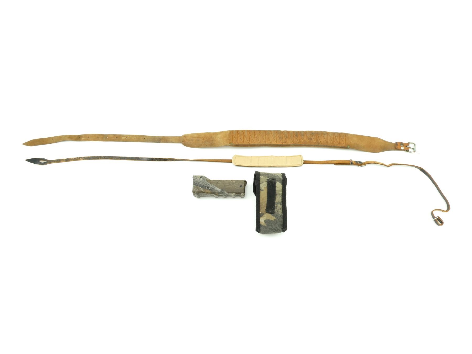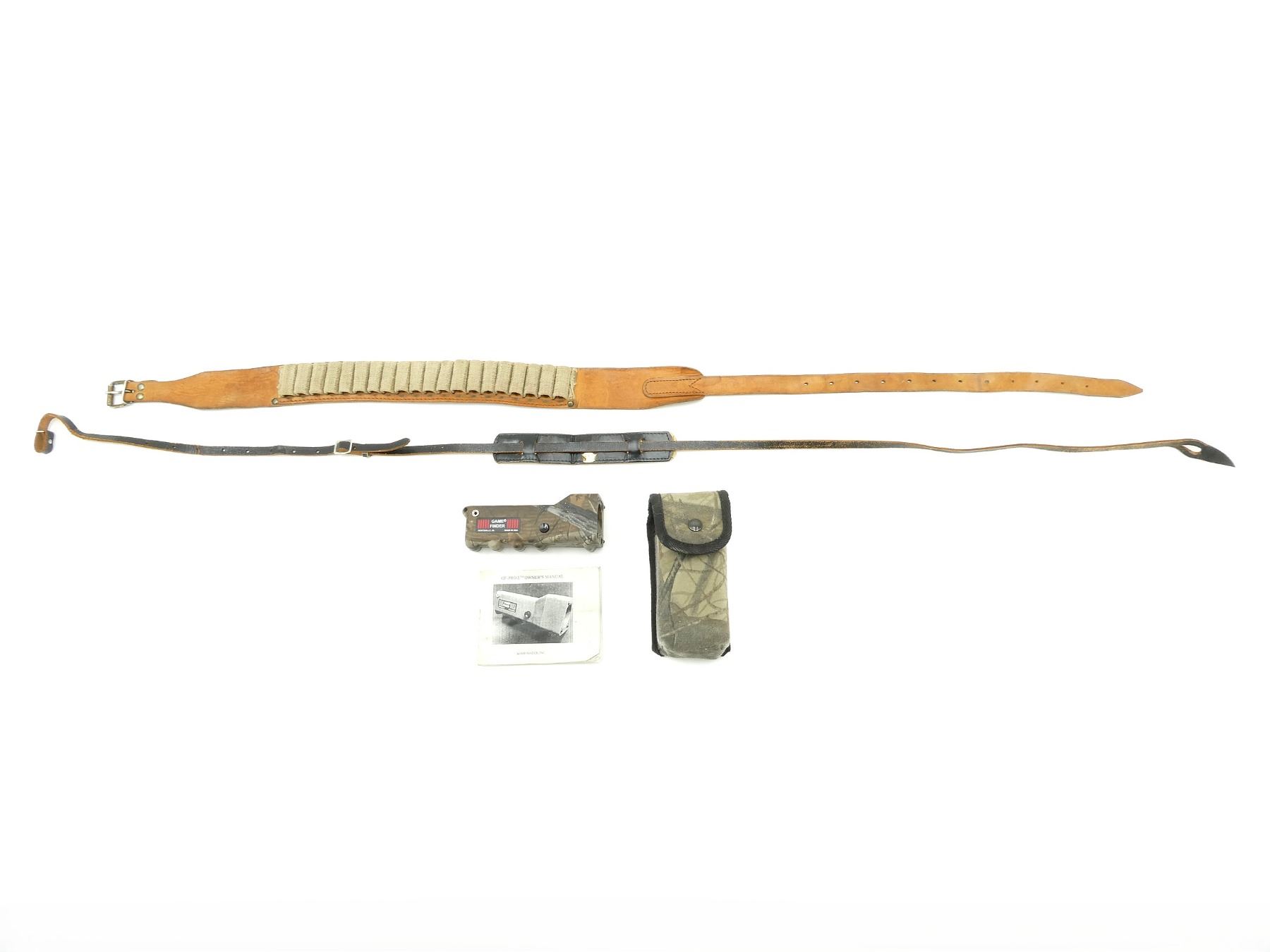 LOT INCLUDES; (1) GAME FINDER PRO E HEAT DETECTOR, WITH CARRYING CASE & INSTRUCTIONS, UNTESTED, (1) LEATHER & CANVAS .45-70 GOVT AMMO BELT, UNMARKED, OVERALL LENGTH APPROX. 45" & (1) BLACK LEATHER BINOCULARS STYLE NECK STRAP, MARKED: "KENT, JAPAN", OVERALL LENGTH APPROX. 55". SEE PHOTOS.
