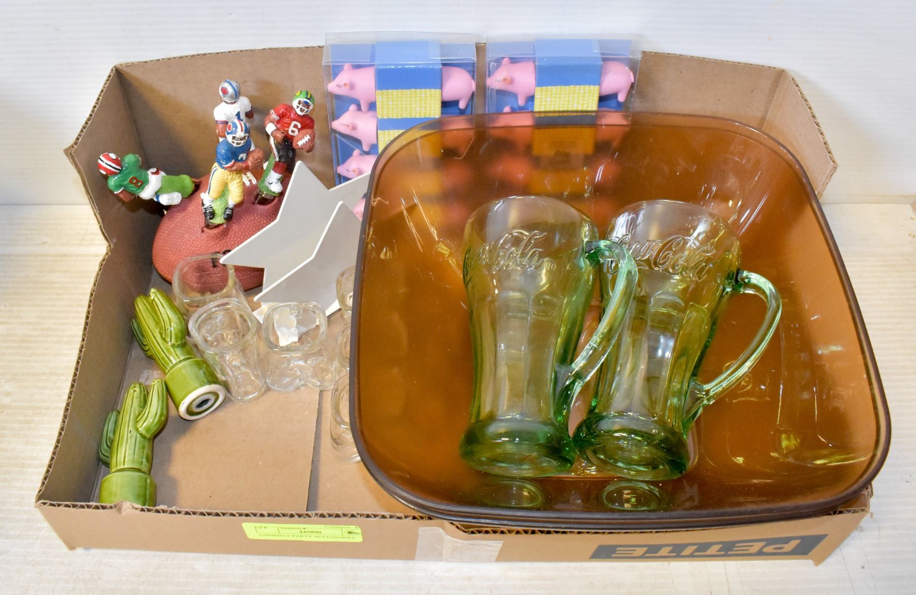 2 CHIP BOWLS; 2 COKE MUGS; 5 PANT SHOT GLASSES; 8 PIG CORN HOLDERS; CACTUS S NAPKIN HOLDER; PARTY KNIVES IN FOOTBALL *UNCLAIMED AS IS*